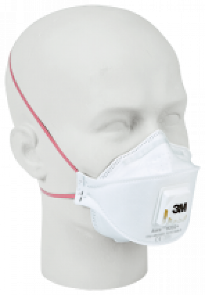 Flach faltbare anatomisch verbesserte Einweg-Partikelmaske 3M der Filterklasse P2 aus Spezialvliesstoff, Schaumstoff- Nasenstück, Nasenbügel, Ausatemventil, zwei Gummibänder, einzelverpackt und lieferbar in Schachteln zu 10 Stück. Gewicht ca. 14 g. Verpackung: 1/12 Schachtel