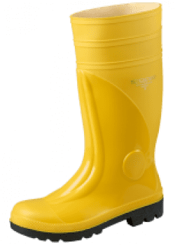 Kunststoff-Bau-Sicherheitsstiefel THE WELLY. Schaft: Aus gelbem, laugen- und säurebeständigem Kunststoff, integrierter Knöchelschutz, Reflexteil hinten, leichtes Trikotfutter, Hosenrutschhemmer innen, Zehenschutz- Stahlkappe, 38 cm hoch (auf 34 oder 30 cm abschneidbar). Sohle: Stahl-Zwischensohle, Laufsohle aus schwarzem, laugen- und säurebeständigem Kunststoff, rutschhemmendes und selbstreinigendes Profil, antistatisch, hitzebeständig bis 70 °C. Grössen 39, 40, 41, 42, 43, 44, 45, 46, 47. Paargewicht Gr. 42 ca. 2460 g.