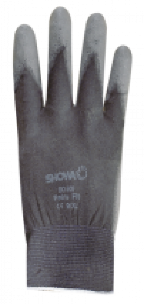 Schutzhandschuhe SHOWA aus Nylongestrick, Farbe schwarz, graue PU-Handflächenbeschichtung, elastische Stulpe, Frauengrössen 6/S und 7/M, Männergrössen 8/L und 9/XL.