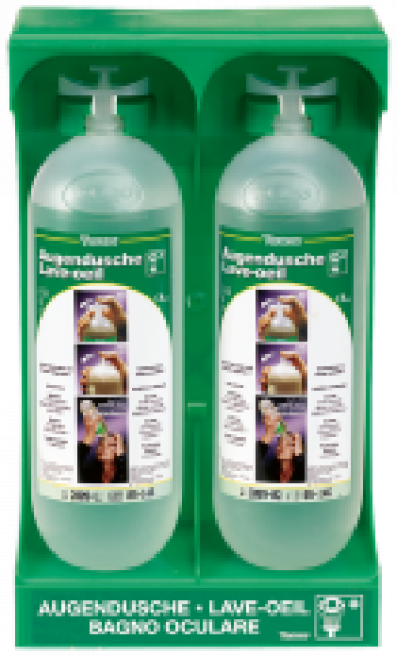 Augenspülstation, bestehend aus einer Wandhalterung aus Kunststoff und zwei eingesetzten Einwegflaschen enthaltend je 1 l sterile Kochsalzlösung 0,9%, Gebrauchsanweisung in Deutsch und Französisch sowie Verfalldatum, Schutzbeutel für die Flaschen, komplett mit einem Satz Schrauben und Dübel für die Wandmontage.